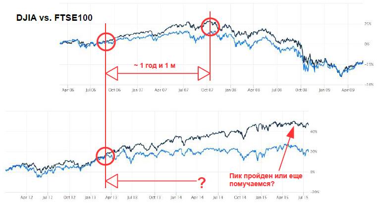 Индекс Доу Джонса перед тем, как обвалиться на рубеже 2008/09 годов, сначала вырвался вперед, а затем, вблизи своего исторического максимума, максимально же опережал в темпе роста индекс Лондонской биржи.