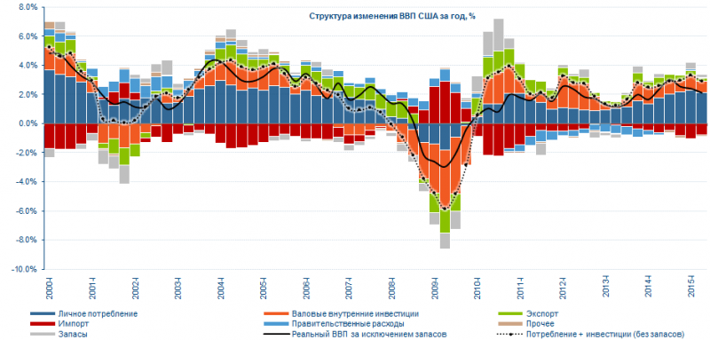 Сделав некоторую ремарку по пересмотрам можно перейти к данным непосредственно второго квартала 2015 года. Здесь нарисовался рост 0.58% за квартал, или 2.32% в годовом пересчете, как публикуют статистики. Относительно второго квартала прошлого года рост составил тоже 2.3%. В общем-то вполне стандартный рост для последних 5 лет, мало чем выдающийся, но рост. Практически весь рост обеспечило потребление (2 п.п), рост экспорта смог компенсировать рост импорта, но это скорее временный эффект, во втором полугодии фактор сильного доллара будет иметь более выраженный негативный эффект для экспортеров. Крайне скромную динамику показали инвестиции и то только за счет «виртуальной» интеллектуальной собственности и небольшого роста жилищного строительства, без этих двух факторов был бы даже минус, т.к. компании инвестиции скорее сокращали. Совсем немного добавили госрасходы. Единственным значимым фактором роста является немного оживившееся потребление правда на фоне унылых инвестиций. Опасность для роста в США здесь в том, что при текущем долларе активность потребителей будет все больше удовлетворяться за счет импорта, что может опустить темпы роста экономики ниже 2%.