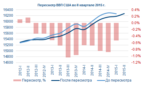 США опубликовали первую оценку ВВП за второй квартал, которая показала уже привычный для последних 5 лет рост в пределах 2-2.5%, если точнее – то 2.3%. Данные за первый квартал пересмотрели с -0.2% до +0.6%. Правда одновременно были пересмотрены данные по ВВП за предыдущие 3 года и оценка ВВП была понижена, в итоге ВВП в 1 квартале 2015 оказался на 0.5% ниже, чем он был заявлен в прошлых релизах, потому радоваться пересмотру данных в 1 квартале вряд ли уместно.