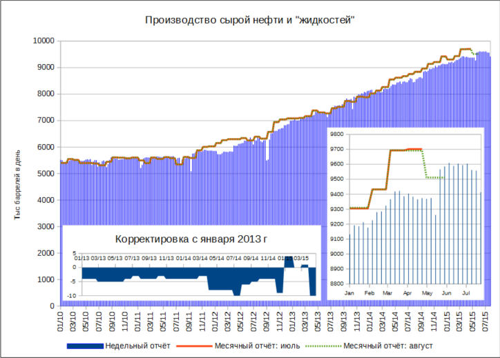 По текущим данным выходит, что максимум добычи прошёл даже не в апреле, а в марте 2015 года (9693 тыс барреля в день, а в апреле -- на 2 тыс меньше).