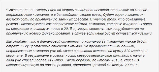 Автор доклада Пол О'Доннелл, аналитик IHS Energy, отметил, что с учетом предварительных данных по списаниям за II квартал 2015 г. (в размере $20 млрд) общий объем списаний активов за два квартала этого года уже превышает прежний рекорд 2008 г., когда на фоне коллапса нефтяных цен компании США и Канады списали $48 млрд.