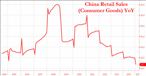 4. Темпы прироста розничных продаж в Китае уже сейчас ниже уровня пика кризиса в 2009 году. Впереди еще резкое кредитное сжатие, так как банки начинают более требовательно относится к заемщикам, инвестиционная активность падает, качество кредитных займов продолжает падать, кредитование под рост фондового рынка сходит на нет и т.д.