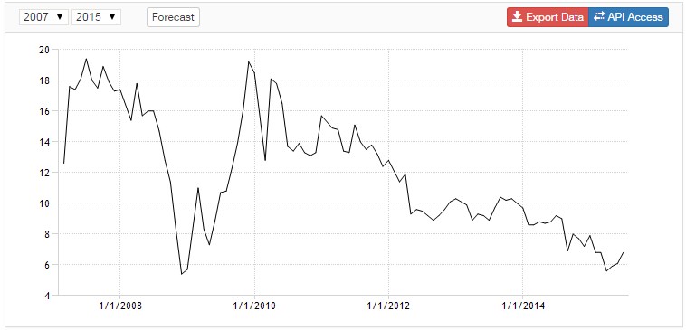 6. Индекс цен производителей на уровне -5,4%. Это происходит из-за того, что юань привязан к доллару, который сильно укрепился за последние 9 месяцев. Что привело к росту стоимости китайских товаров в мире. Также отрицательно повлияли девальвации валют многих стран мира. Можно посмотреть на примере России, где видно, что это снизило экспорт из Китая на 36-44%. Если учесть, что другие страны девальвировали свои валюты несколько позже и действует временной лаг, то снижение экспорта из Китая в эти страны еще впереди!