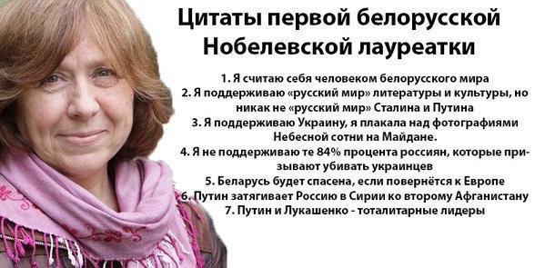 Кстати, официальная Москва также не спешила с поздравлениями пишущей на русском языке писательнице: ее, правда, поздравил министр культуры, но вот высшее руководство предпочло отмолчаться. "Я на первой пресс-конференции (после сообщения о присуждении премии. – Ред.) сказала, что Украину оккупировали. Тут вся любовь Путина и Медведева ко мне и кончилась", - рассуждает Алексиевич.