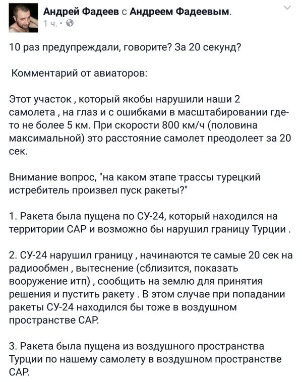 А вот мне показалось, что пересечение траекторий этих самолетов было ДО границы Турции, т.е. его летели сбивать целенаправленно, в надежде что он упадет на территории Турции, но летчики смогли протянуть до выхода за пределы границы. Честь и хвала нашим летчикам. Так что провокация в чистом виде.