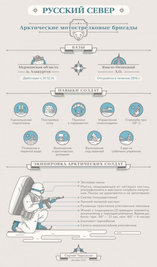 Тут Россия тоже опережает многих своих конкурентов. В 2014 году Минобороны РФ объявило о создании Арктических войск России, фактически — еще одного военного округа. Основой Арктических войск был заявлен Северный морской флот ВМФ России, в них также войдут 200-я мотострелковая бригада в Печенге, 40-я бригада морской пехоты Тихоокеанского флота на Камчатке и вновь созданные «арктические» бригады. Россия возводит военные базы на Новой земле и Земле Франца-Иосифа.