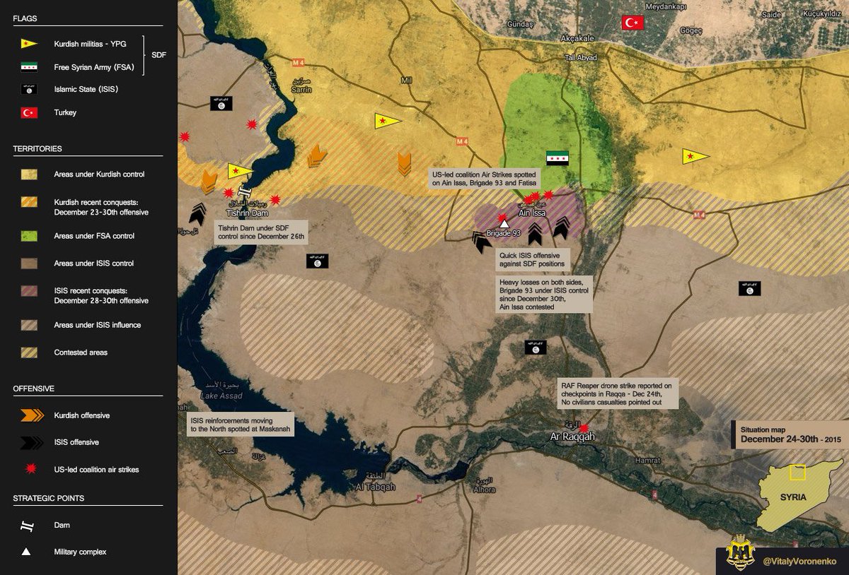‘Айн-Исса стратегически расположен недалеко от турецкой границы с провинцией Аль-Ракка; он был отобран у ИГИЛ в начале этого года, в результате чего вышеупомянутая террористическая группа потеряла один из своих самых важных пограничных переходов в Турцию.