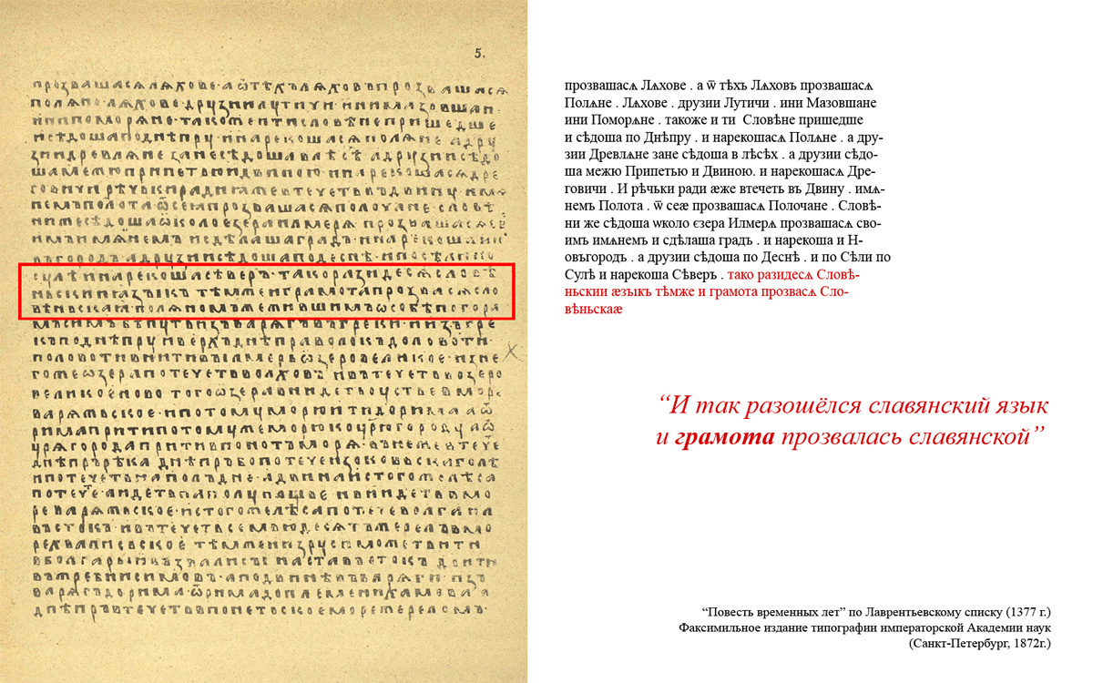 В данном случае нас крайне интересует слово «грамота», упомянутое в тексте, которое не может трактоваться иначе как «письменность». Речь идёт о временах расселения славянских племён (задолго до призвания Рюрика).