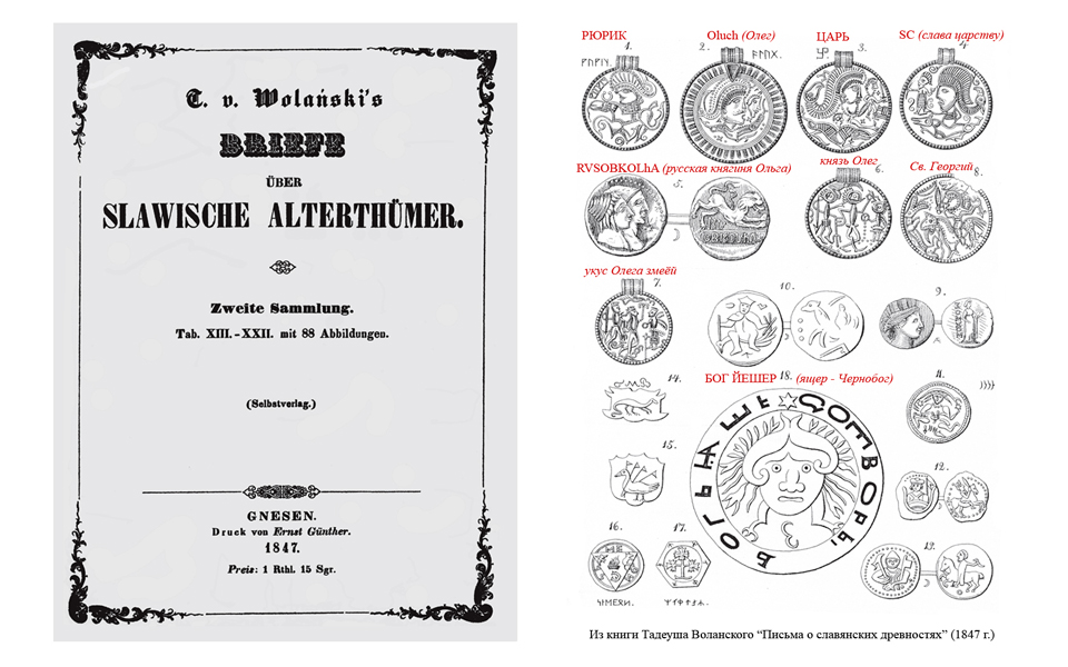 Основной массив материала для своего очерка Классен почерпнул из книги поляка Тадеуша Воланского «О славянских древностях». Эта книга вышла в свет в 1846-47 гг. в Варшаве. В ней известный археолог, коллекционер древностей, обладатель огромной библиотеки древних рукописей, Тадеуш Воланский, излагал и документально подтверждал огромным количеством артефактов (в книге приведены целые таблицы с иллюстрациями), гипотезу о славянском происхождении этрусков и многих других древних цивилизаций. Древней Руси и древнерусскому языку в этой гипотезе отводилось важнейшее место, как ключевому связующему звену между древностью и современностью. Сразу после выхода в свет книга произвела эффект разорвавшейся бомбы. Ещё бы — монеты и медальоны «времён древнего Рима» изобилуют руническими и кириллическими надписями, имеющими прочтение на древнерусском языке: