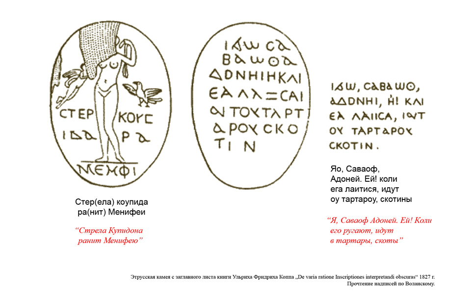 А теперь, как говорят в передаче «Что? Где? Когда?», внимание, вопрос: «рассматривался ли среди «известных европейских языков», при помощи которых учёные пытались дешифровать этрусские тексты, русский?» Досрочный ответ: «НЕТ! Не рассматривался!»