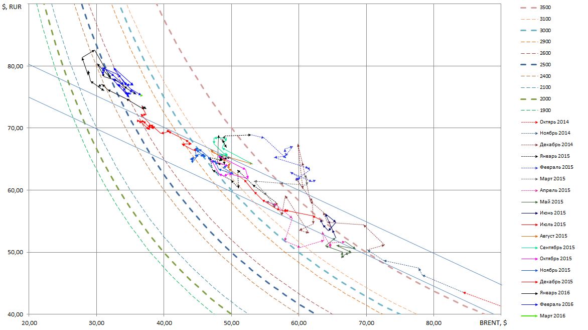 Очень наглядно. Похоже что за исключением диапазона 50-70, когда курс рубля сильно лихорадило (январь-февраль 2015), остальные точки очень неплохо ложатся на линию. Можно формулу вывести )))