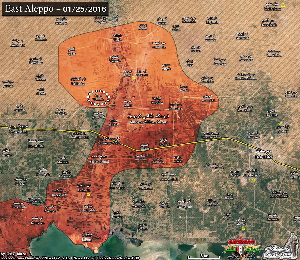 Информированные эксперты утверждают, что масштабное наступление призвано обеспечить буфер безопасности вокруг авиабазы Kuweires, которая может быть технически и организационно вновь активирована для действий сирийских и российских самолетов. Это происходит на фоне противоречивых сообщений о транспортировке русских передовых ракет и радиолокационных станций в последние дни.