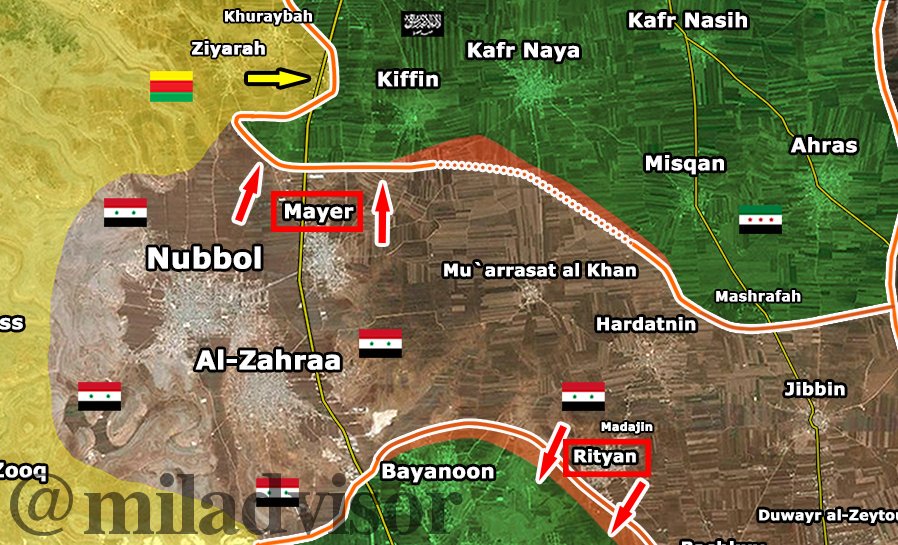 Ранее этим же днём сирийские правительственные войска в ходе продолжающегося масштабного наступления отбили у боевиков населённые пункты Кафр-Найя и Мейир.