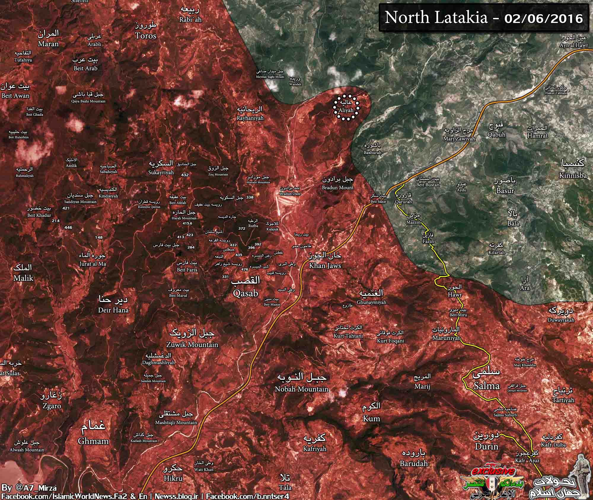 В субботу во второй половине дня на севере провинции Латакия 103-я бригада Республиканской гвардии (РГ), при поддержке подразделений морской пехоты Сирии, бригады “Ястребы пустыни”, Сил национальной обороны и Сирийской социальной националистической партии (ССНП), после ожесточённых боёв с исламистами из группировок “Джабхат ан-Нусра” (сирийское крыло “Аль-Каиды”) и “Свободная сирийская армия” установила полный контроль над деревней Алия.