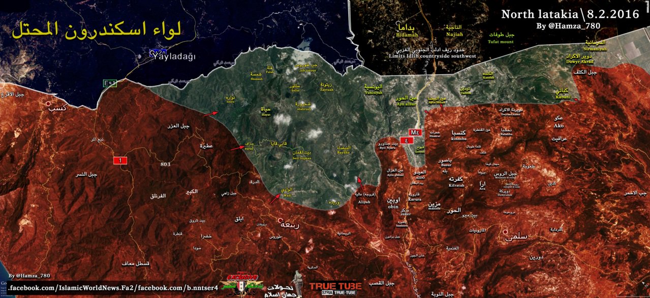 На севере провинции Латакия армейцы при поддержке сил народного ополчения восстановили безопасность и стабильность в населённых пунктах Аль-Хамрат, Ад-Деруна, Айн Аль-Кантара, Махшаба, Рувейсет Аль-Кетф, Рувейсет Талюкши, Рувейсет Вата Ас-Синдиана и Нахшаба, в нескольких стратегических точках и окрестностях Кенсаба.