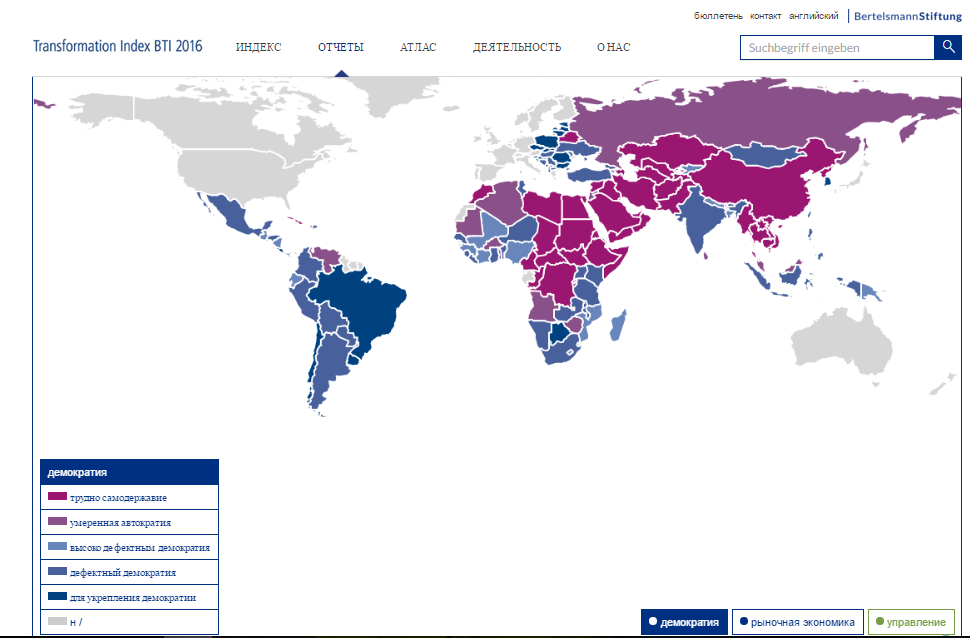 Недавно (в феврале 2016) крупнейший в Германии частный фонд Бертельсмана со штаб-квартирой в Гютерсло выпустил свое очередное исследование. Раз в два года с помощью экспертов по всему миру фонд составляет «индекс трансформации Бертельсмана» (ИТБ). Более 3 тысяч страниц сего труда посвящены ситуации с демократией и социальной рыночной экономикой в отдельно выделенных фондом странах - пристальному рассмотрению подвергаются исключительно развивающиеся страны, и те, которые встали на путь построения рыночной экономики. В развитых же странах (США, Канада, Австралия, страны западной Европы) по мнению аналитиков никаких проблем нет, потому как о них в исследовании не упоминается от слова "абсолютно" (даже для сравнения).