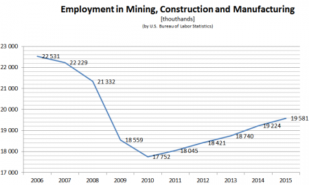 Тут все понятно. С пиков, предшествующих кризису, активная фаза которого началась в 2008, эти отрасли потеряли около 2,3 млн. рабочих мест, при этом потери доходили до 4,3 млн. рабочих мест, но благословенные зеленые ростки вылились в новые 2 млн рабочих мест.