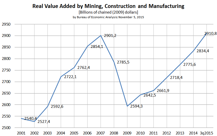И что же мы видим? Реальное значение (т.е. очищенное от фактора инфляции пересчетом в цены 2009 года) добавленной стоимости производящих товары отраслей промышленности США превысили предыдущие пики.