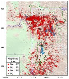 На этом изображении зелёным обозначены границы Йеллоустонского национального парка. Едва видимая жёлтая линия очерчивает кальдеру супервулкана. Красными точками обозначены все землетрясения, недавно зафиксированные в Йеллоустоуне. Возможно ли, что именно по этой причине для общественности был закрыт доступ к сейсмограммам?