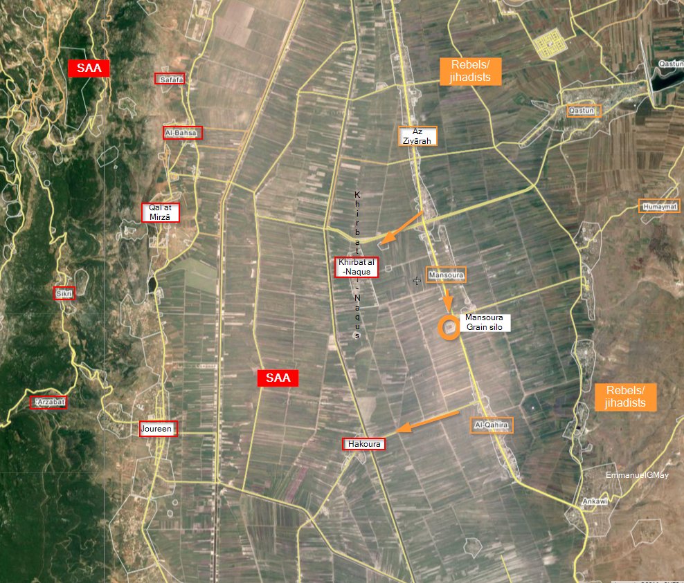 Исламисты начали атаку с отправки на элеватор Мансуры двух смертников на заминированных автомобилях. Один из них достиг своей цели и вынудил солдат Сирийской Арабской Армии покинуть свои позиции на этом важном объекте. После взятия элеватора джихадисты успели продвинуться в нескольких местах в районе Хирбет-ан-Накуса и Мансуры, пока над полем боя не появились самолёты Сирийских Арабских ВВС, оказавшие наземным частям поддержку с воздуха в отражении атаки “Джунд аль-Аксы” и “Исламской партии Туркестана”.