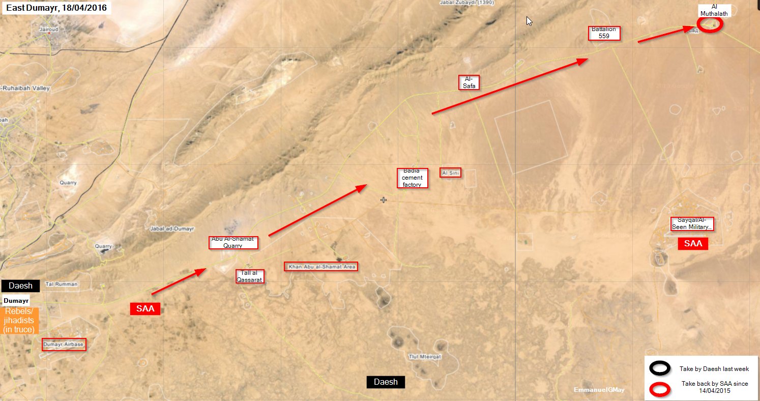 18/04/2016 ИГИЛ начали новое наступление на востоке провинции Дамаск в понедельник утром, нацелившись на цементный завод Badiyah, контролируемый САА, Tal Абу аль-Shamat и Таль Аль-Сафа близ оспариваемого города Думейр.