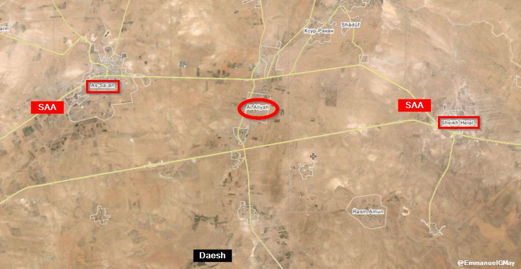 По словам военного источника на военном аэродроме Хама, Сирийские вооруженные силы ввели полный контроль над деревней Aliyah после ожесточенной битвы с террористами ИГ в районе стратегического города' Итрия. Источник добавил, что Сирийские вооруженные силы убили 14 террористов ИГИЛ, а также уничтожили 3 их бронированных машины с 14.5мм зенитными пулеметами.