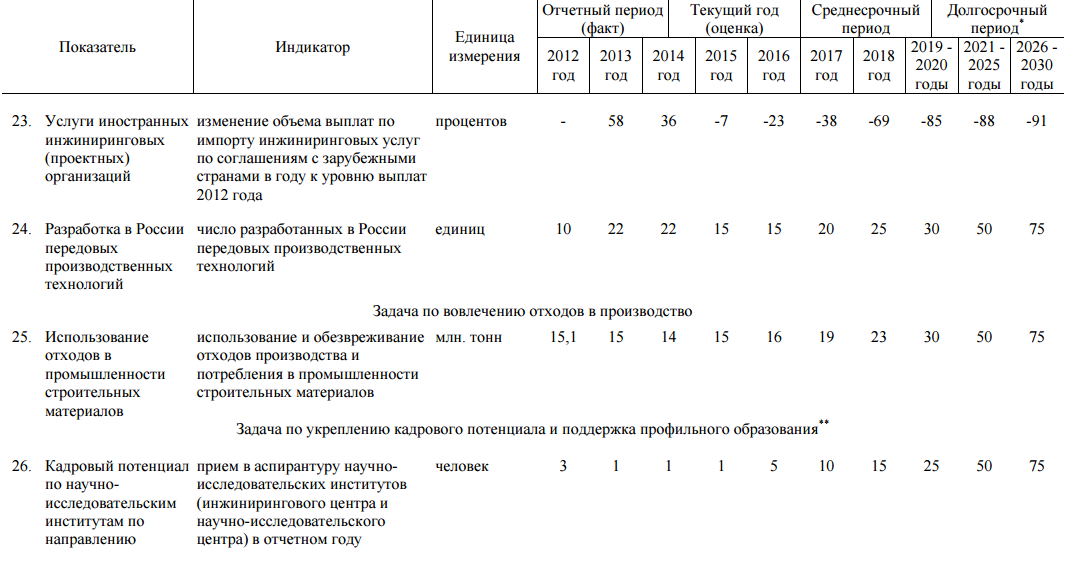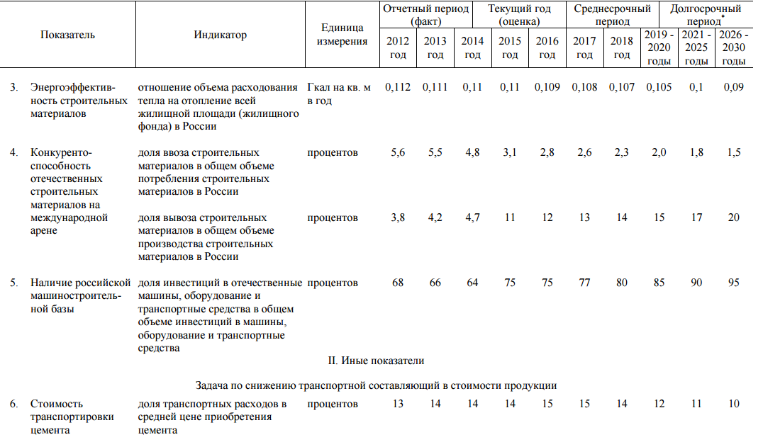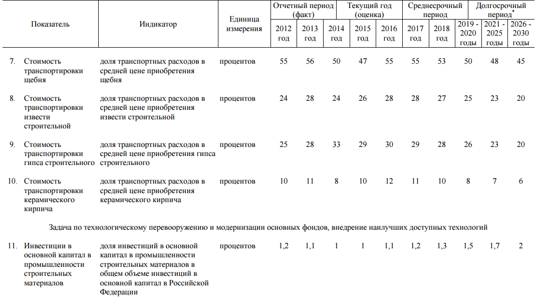 Приоритетами развития отрасли в Стратегии, в частности, определено: совершенствование системы пространственного размещения предприятий, обеспечивающих баланс спроса и предложения на уровне федеральных округов и субъектов Российской Федерации в среднесрочной и долгосрочной перспективе; обеспечение условий для снижения транспортной составляющей в стоимости продукции для потребителей; создание условий для вовлечения техногенных и коммунальных отходов в производство строительных материалов в качестве сырьевых и топливных компонентов; совершенствование технического регулирования; выработка мер стимулирования экспортно ориентированных производств; создание комфортных, конкурентных и побуждающих условий для организации новых производств, проведения технологического перевооружения и модернизации основных фондов отрасли.