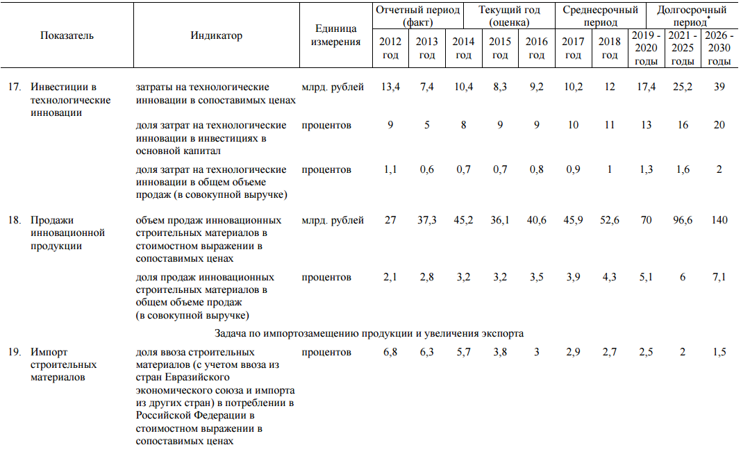 Реализация Стратегии будет способствовать формированию высокотехнологичной, конкурентоспособной, устойчивой и сбалансированной (в части спроса и предложения) промышленности строительных материалов инновационного типа, обеспечивающей внутренний и внешний рынки качественной, доступной и энергоэффективной продукцией, снижению зависимости отрасли от зарубежных технологий, оборудования и сырьевых компонентов, обеспечению занятости населения и повышению уровня жизни граждан.
