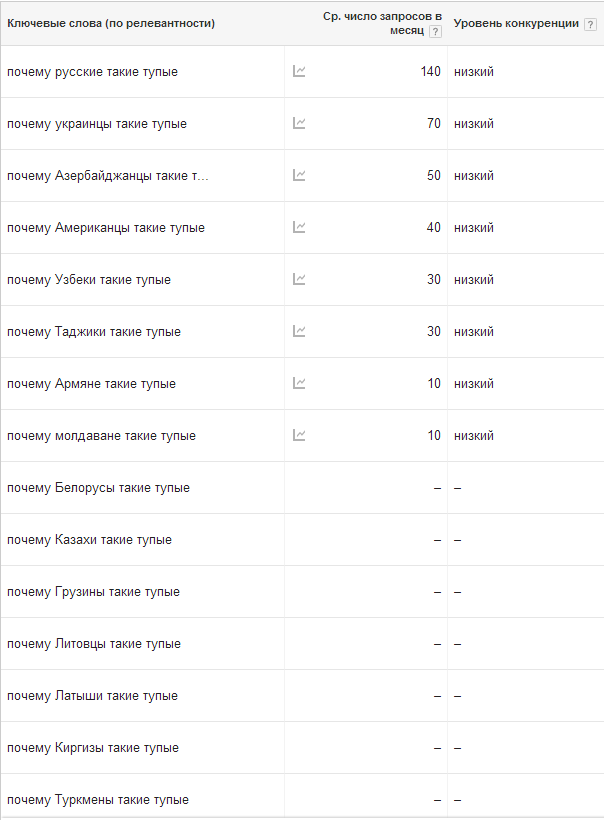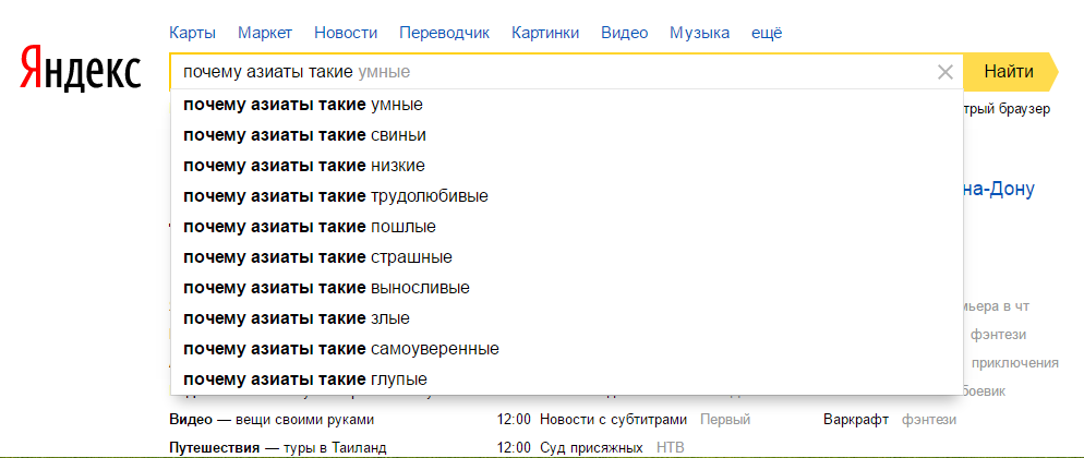 Ничего странного не замечаете? Правильно — мы практически всех вокруг считаем тупыми, это самый распространённый эпитет. С некоторым уважением относимся мы только к евреям, немцам и японцам — у них мы находим другие недостатки. И только корейцы стоят особняком, корейцев русские пользователи «Гугл» как-то аномально любят, не знаю уж почему.
