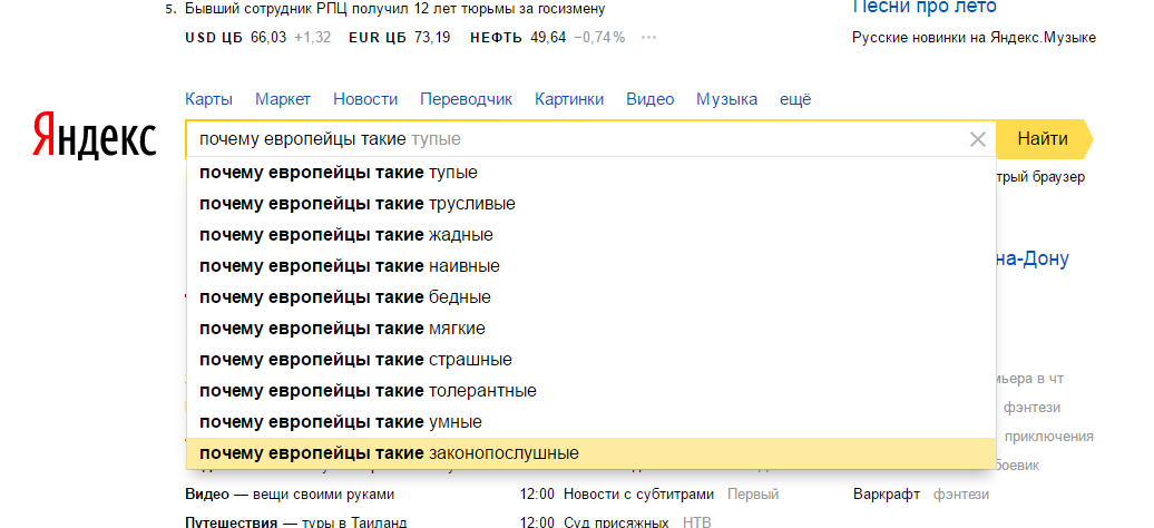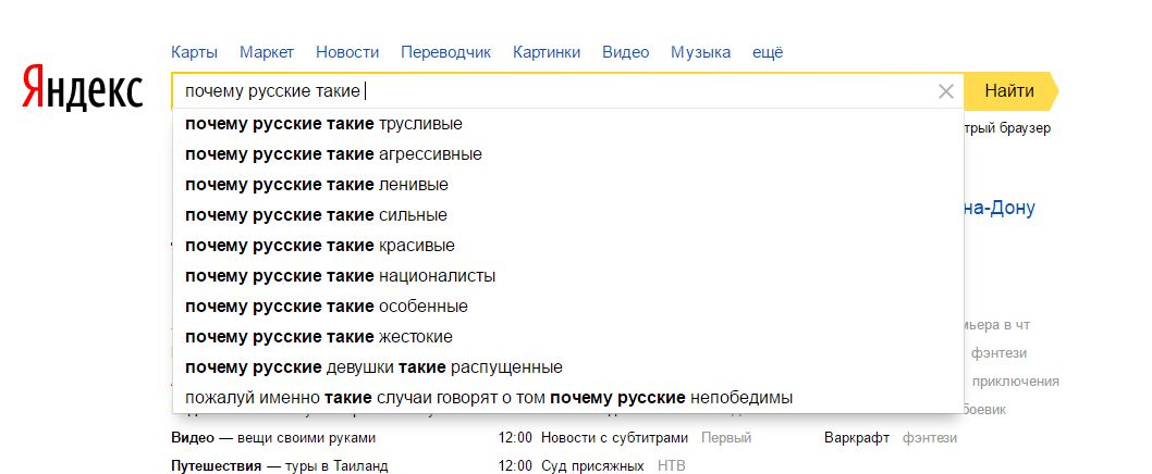 Чудовищно, верно? Мы ненавидим всех, и себя в первую очередь. Можно, конечно, повозмущаться русофобией «Гугл», но, судя другим поисковым запросами, проблема тут вовсе не в русофобии. «Гугл» всего лишь выступает в виде зеркала — наглядно демонстрирует нам наши собственные предрассудки.