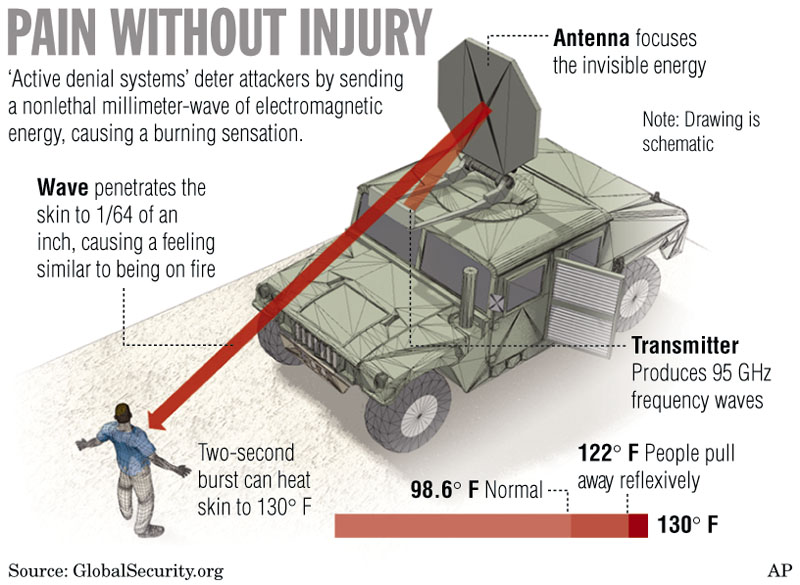 Впрочем, для успокоения туземных «армий» электроразрядные пулеметы и не понадобятся. Вполне достаточно дистанционных микроволновых нагревателей: когда твоя кожа мгновенно нагревается до 60-90 градусов – тут не забалуешь. И здесь вам не банная парилка, направленные микроволновки не воздух нагревают, а влагосодержащие живые ткани – так что могут и глаза на лоб вылезти. Если кому-то мои утверждения покажутся фантастичными – поройтесь в Интернете. Микроволновые излучатели давно уже стоят на вооружении западных армий, фотографии этих устройств легко найти в Сети.