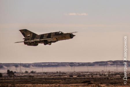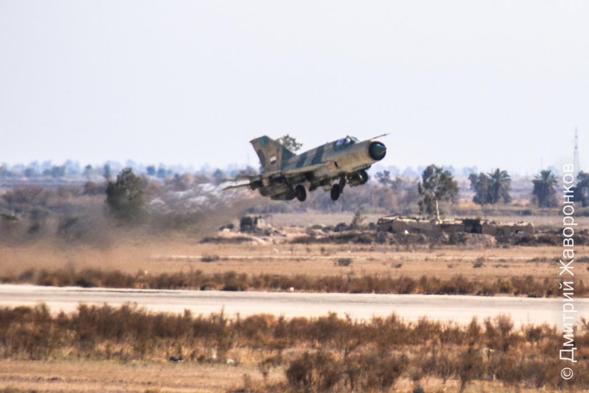 И уж точно никогда не думал увидеть МиГ-21 его в полёте. Но вот — стою на аэродроме Дейр-эз-Зора. На фото он виден в правом верхнем углу.