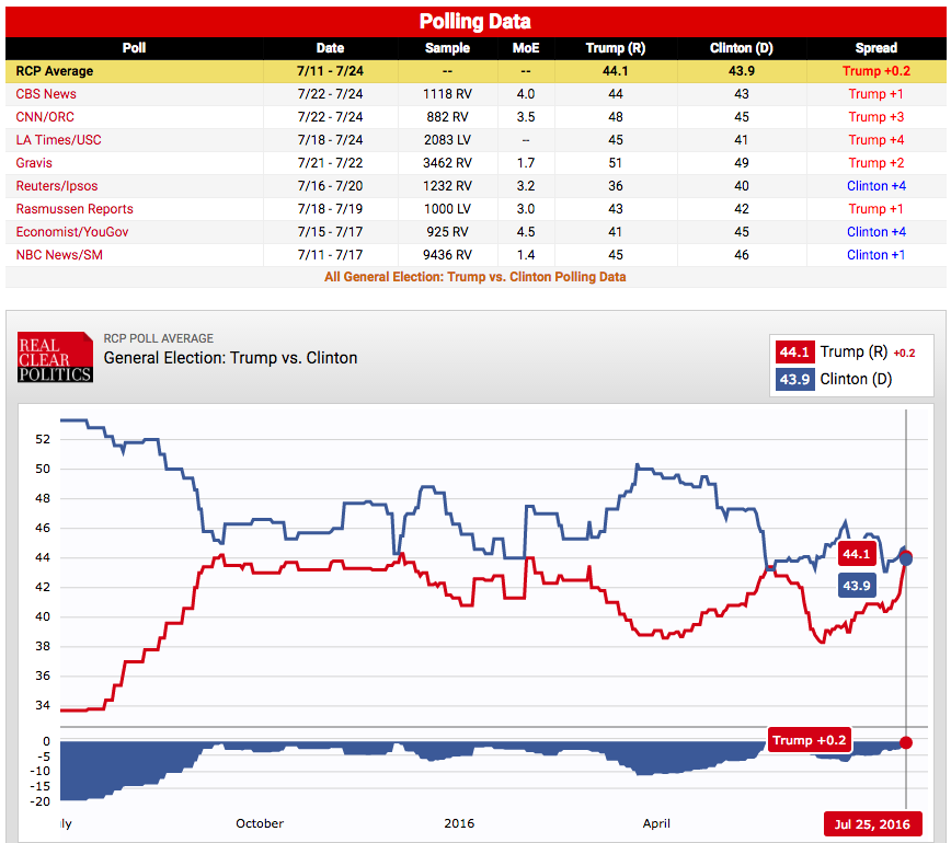 В большей мере, опросы общественного мнения - это механизм обратной связи, который показывает популярность среди избирателей различных проектов продвигаемых кандидатами (окукливание - Трамп и гегемония - Клинтон). С этой точки зрения, приведенные выше данные показывают одинаковую, на текущий момент, степень поддержки этих проектов и, следовательно, вероятность их реализации.