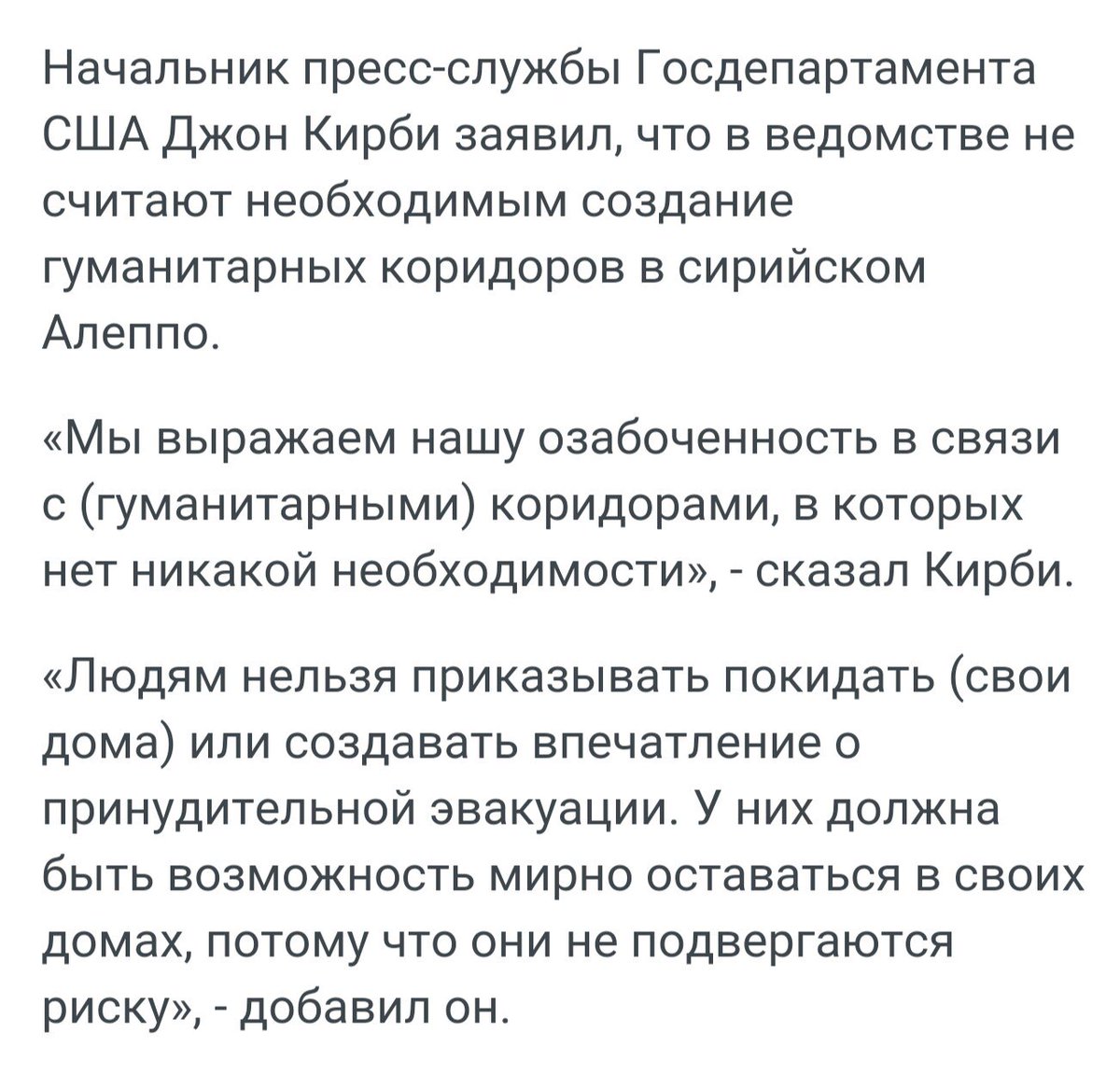 Если в этом будет необходимость, то гуманитарные коридоры для мирных конвоев будут открыты не только из Алеппо, но и в этот город. Однако ни при каких обстоятельствах, мы не допустим, чтобы в районы, которые контролируют боевики, поступало дополнительное оружие извне».