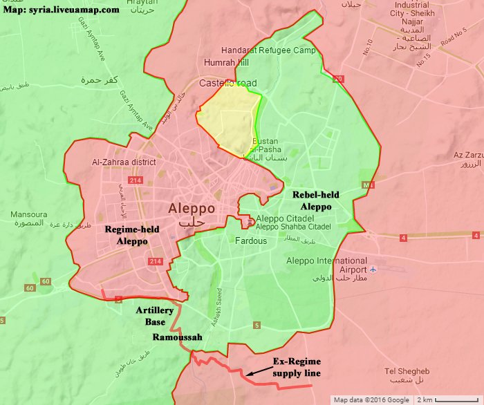 Трасса проходящая вдоль квартала Хамадания и застройки 3000 проходит прямо перед передним краем САА и легко просматривается с господствующей над местностью академией "Аль-Ассад", поэтому при текущей конфигурации организовать по ней снабжение Алеппо невозможно.
