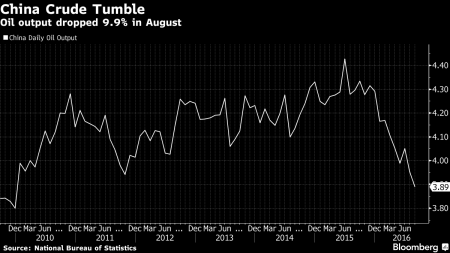Еще одна из страна, входящая в 10 наибольших нефтедобытчиков сообщает о коллапсе добычи нефти (а Китай - мировой нефтедобытчик номер 5) - нефтедобыча Китая обрушилась в августе на 9.9% по сравнению с тем же месяцем год назад, а за период январь-август - на 5.7% (т.е. добыча падает с ускорением!). Текущие объемы составляют 3.89 миллиона баррелей в день, самый низкий уровень с декабря 2009.