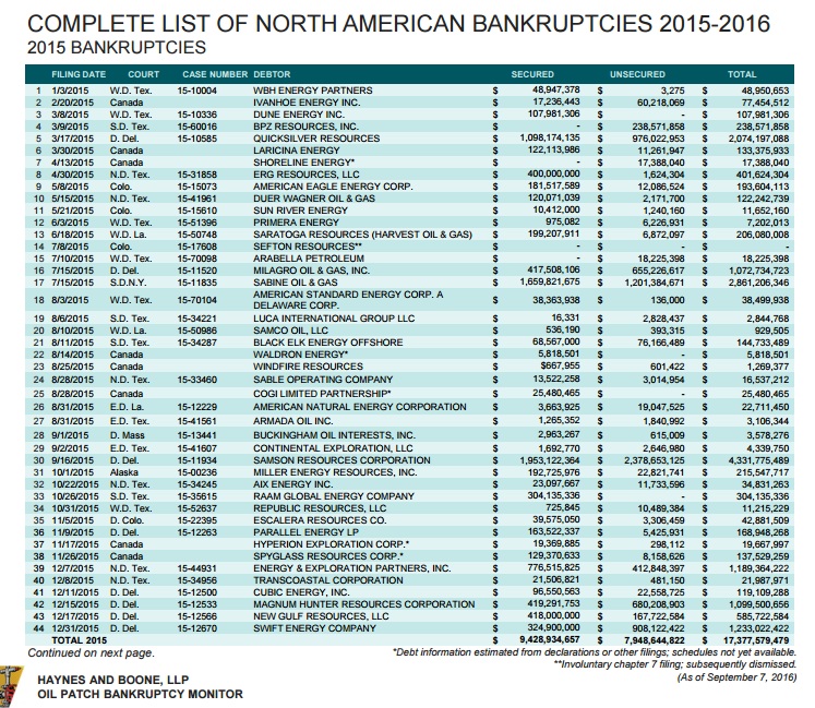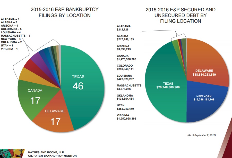 Юридическая фирма "Haynes & Boone LLP" сообщает, что на начало сентября 2016г., долговые обязательства нефтегазовых компаний-банкротов Северной Америки, как обеспеченных, так и не обеспеченных активами достигли цифры в ~$67,8 млрд. (учтены главы 7, 11, 15 Кодекса о банкротстве + компании из соседней Канады).