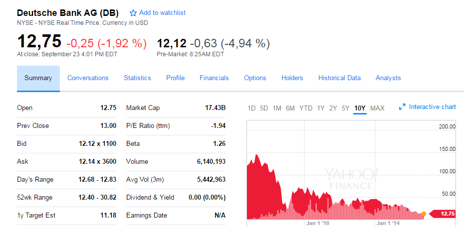 А мне кажется это все цирк. ЕЦБ не даст крупным банкам утонуть. Сколько там нужно Дойче-банку на докапитализацию и на штраф? Ну, допустим, 100млрд. Дойче-банк выпускает облигации на 100500лет под любой процент (даже отрицательный). ЕЦБ с радостью выкупает эти "супернадежные" бумаги - акции снова переходят к росту. И так можно очень долго качели качать...