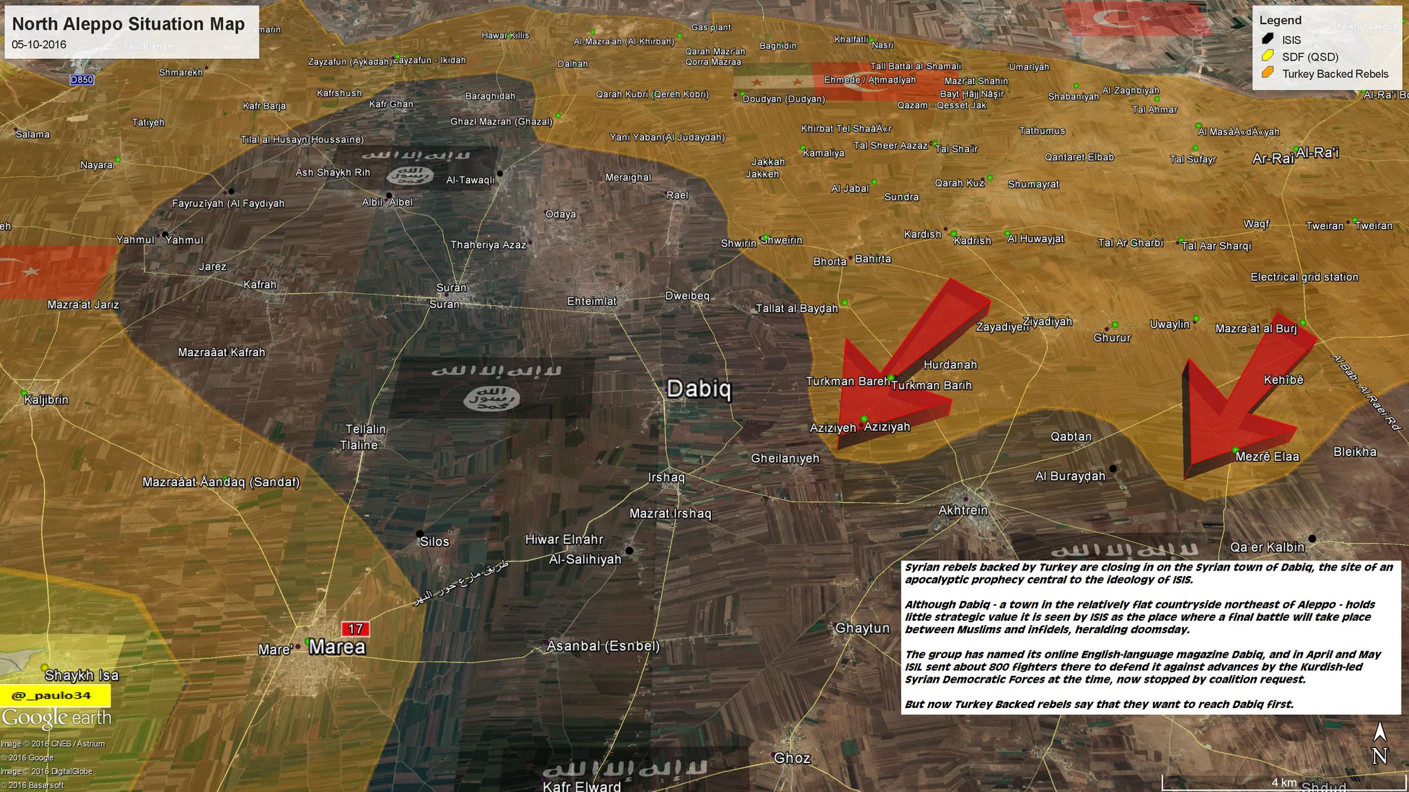 04/10/2016 Карты, отражающие текущую ситуацию на севере провинции Алеппо на 4 октября. Боевикам с помощью Турции необходимо преодолеть 18 километров, чтобы достичь Аль-Баба, и 11 - чтобы замкнуть кольцо окружения вокруг группировки террористов «Исламского Государства»* в районе Дабика.