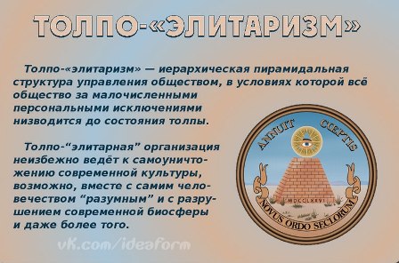Итак, Толпо-«элитаризм» – это иерархическое пирамидальное устройство общества, в котором высшие слои общества не признают человеческого достоинства нижних слоёв общества. Культура, порождаемая таким устройством общества, препятствует освоению творческого потенциала людей, вследствие чего, большинство искусственно низводится до состояния толпы.