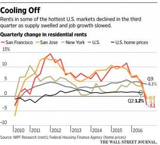 Но тревожные звонки звенят и здесь - риэлторы США сообщают, что впервые с 2010 года в ключевых наиболее жирных регионах (типа Нью-Йорка или Сан-Франциско) началось падение стоимости аренды жилья. В целом по стране еще рост, но с серьезным замедлением (3% против 5.2% год назад).