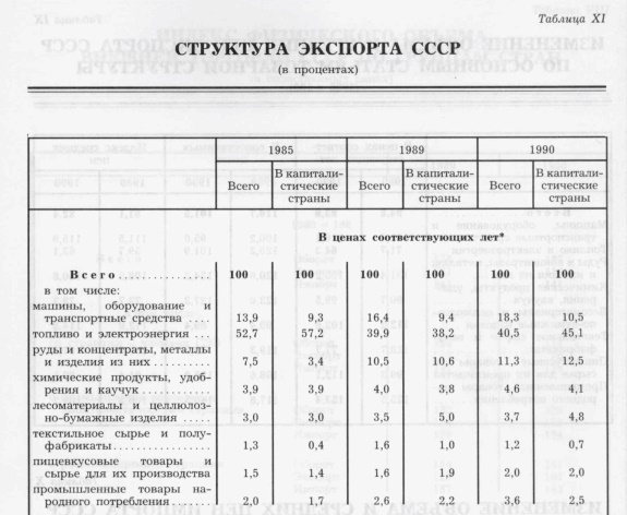В 1985 году (т.е. до проявлений последствий деятельности М.С.Горбачёва) СССР экспортировал в кап.страны 57,2% топливно-энергетических товаров от своего экспорта. (Внешние экономические связи СССР в 1990 г. , стр 20). В 2016 РФ экспортирует в дальнее зарубежье 62,6% ТЭт.