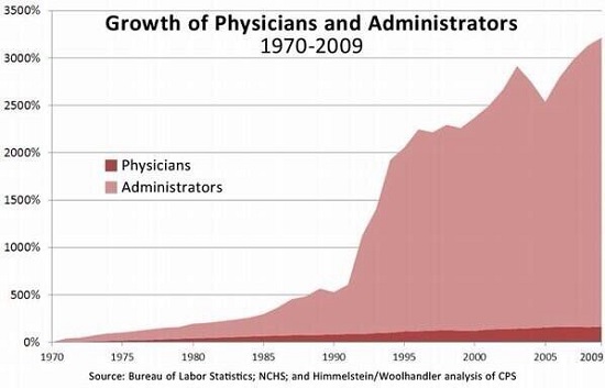 Вот график, который намекает на ответ - он показывает прирост врачей и административного персонала с 1970 года.