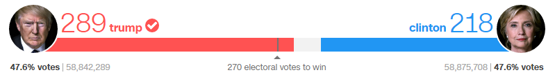 Парадокс их избирательной системы. Разницы в голосах избирателей уже сейчас практически нет и вполне возможно, что к закрытию у Клинтон их может стать даже больше. Но победа все равно останется за Трампом.