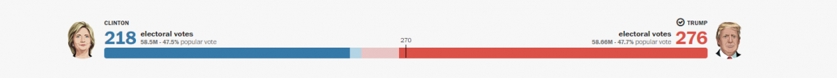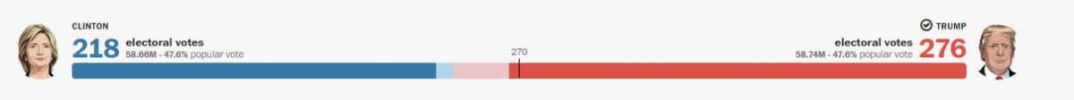 До того ка Трамп набрал 276 голосов выборщиков его отрыв от Клинтон был 1,02 млн голосов.