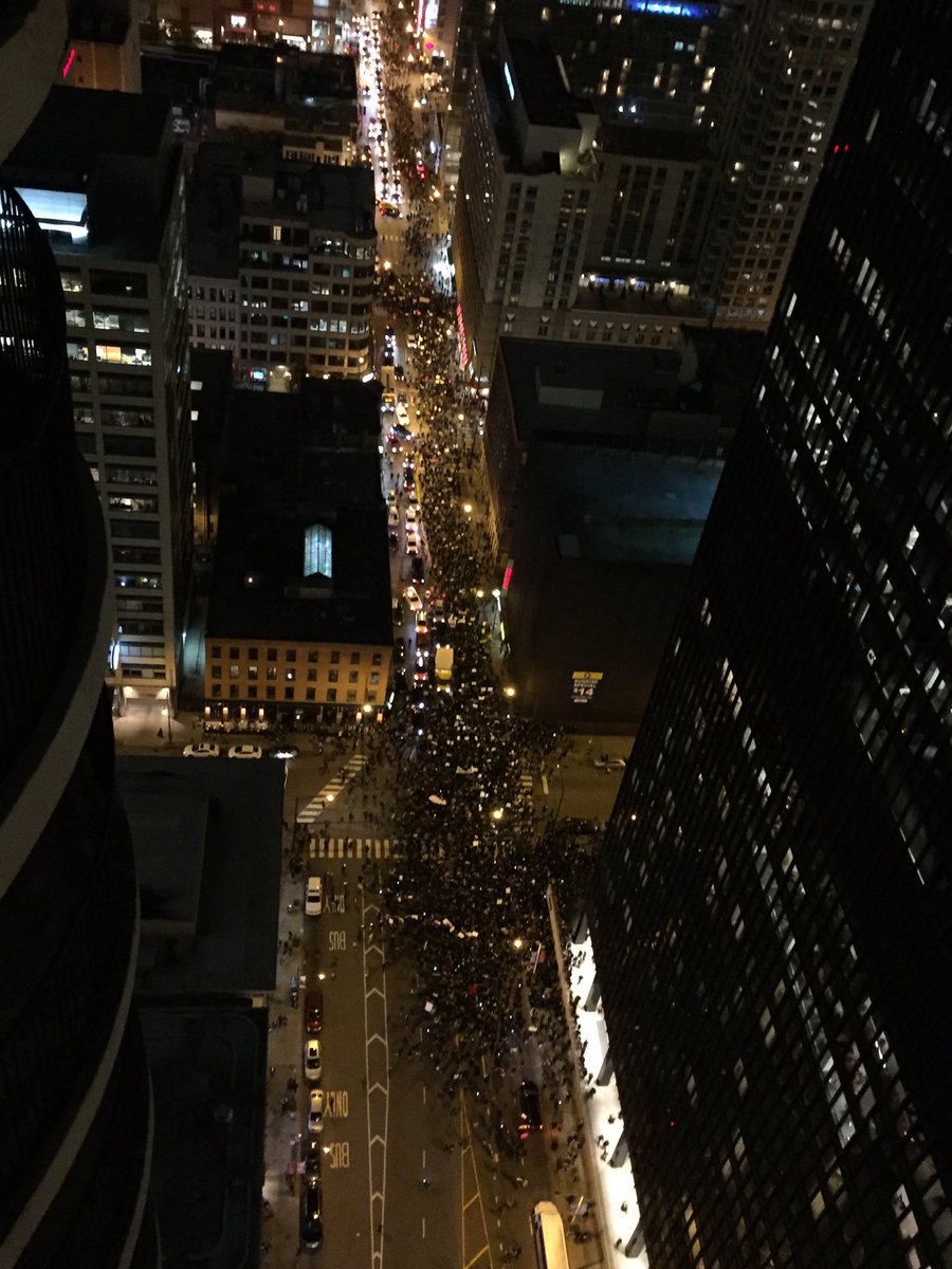 Одна из крупных демонстраций прошла в Нью-Йорке. По данным полиции, в ней приняли участие около 5 тыс. человек. Протестующие собрались возле небоскрёба Trump Tower, где находится штаб-квартира миллиардера. Люди держали плакаты с лозунгами «Нет расизму! Нет фашизму!», «Не мой президент! Не сегодня», «Я всё ещё с Хиллари» и прочие.