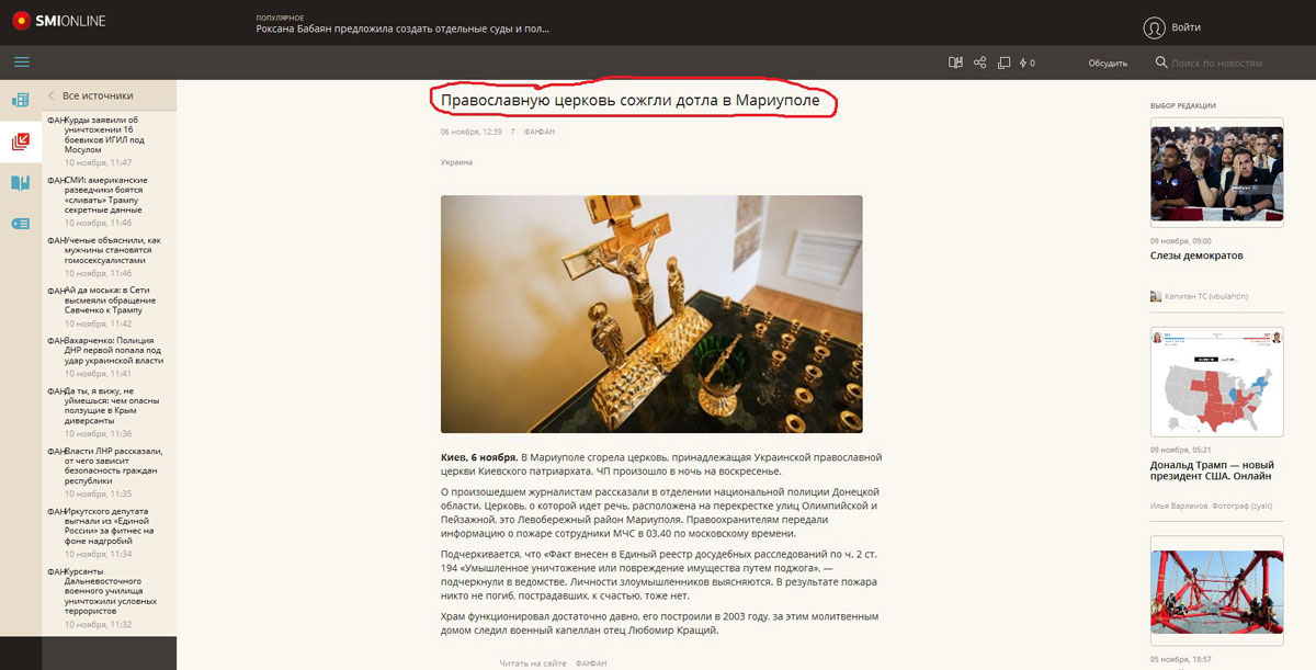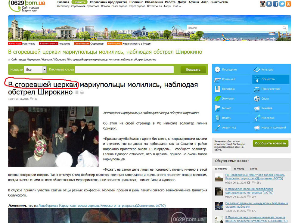 6 ноября на просторах украинских новостных порталов появилась новость, что в Мариуполе дотла сгорела церковь Киевского Патриархата.