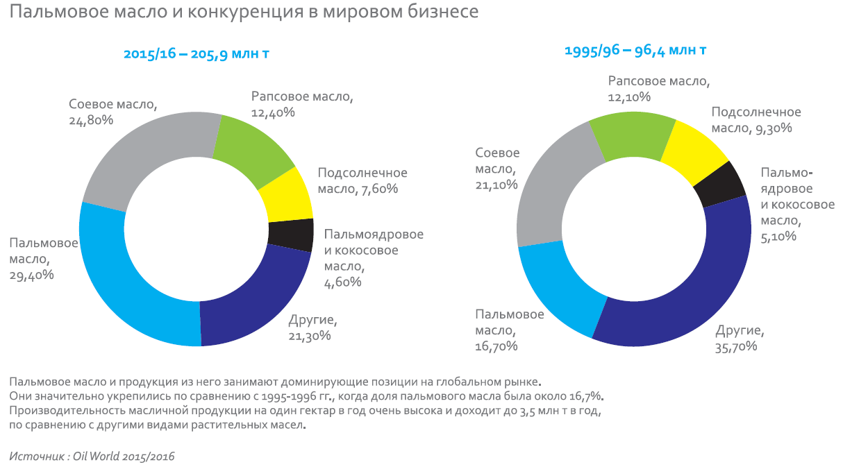 При этом производительность масличной продукции на один гектар в год очень высока по сравнению с другими видами растительных масел, доходя до 3,5 млн т в год. Ближайший конкурент пальмовому маслу – масло соевое (на его долю приходится 24,8%).