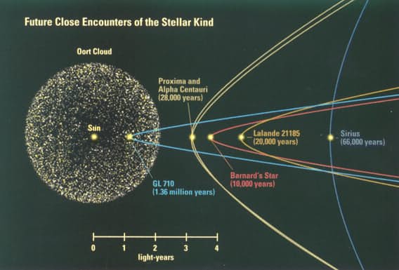 P.S. Кстати, судя по рисунку в новости, гораздо раньше, всего через 28 тыс. лет звезда Альфа Центавра, имеющая массу примерно как у Солнца, пройдёт в 3 световых годах от Солнца (сейчас в 4 с чем-то световых годах). И если она имеет такое своё "облако Оорта", сравнимое с солнечным, то два облака пересекутся.
