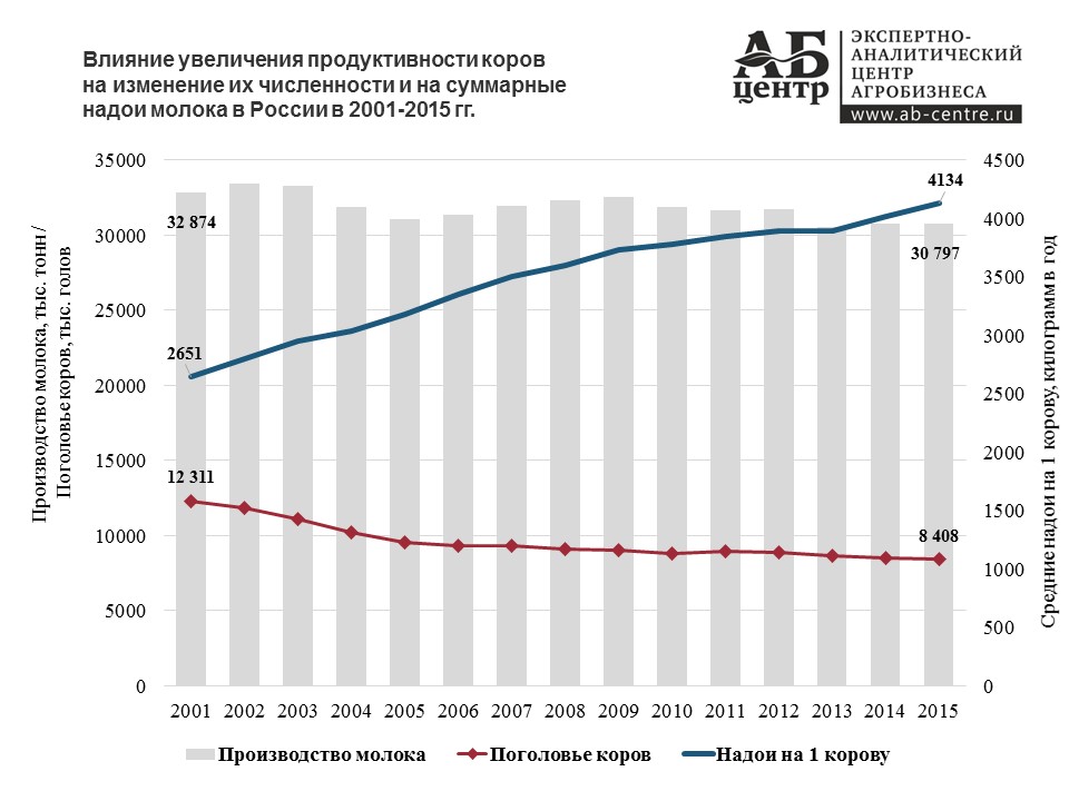 1. Относительно стабильным объемом предложения сырья для производства сухого молока. Производство свежего молока в России на протяжении 2013-2016 гг. находится на уровне 30,5 - 30,9 млн тонн. При этом производство молока в коммерческом секторе (сельхозорганизации и крестьянско-фермерские хозяйства) имеет устойчивую тенденцию к росту, в хозяйствах населения, напротив, падает. Важно отметить, что в отрасли молочного скотоводства России в последние годы отмечается существенное повышение эффективности производства - растут надои молока на 1 корову. Это в свою очередь оказывает влияние на изменение численности коров в сторону их снижения. Как ожидается, эта тенденция продлится и в долгосрочной перспективе.